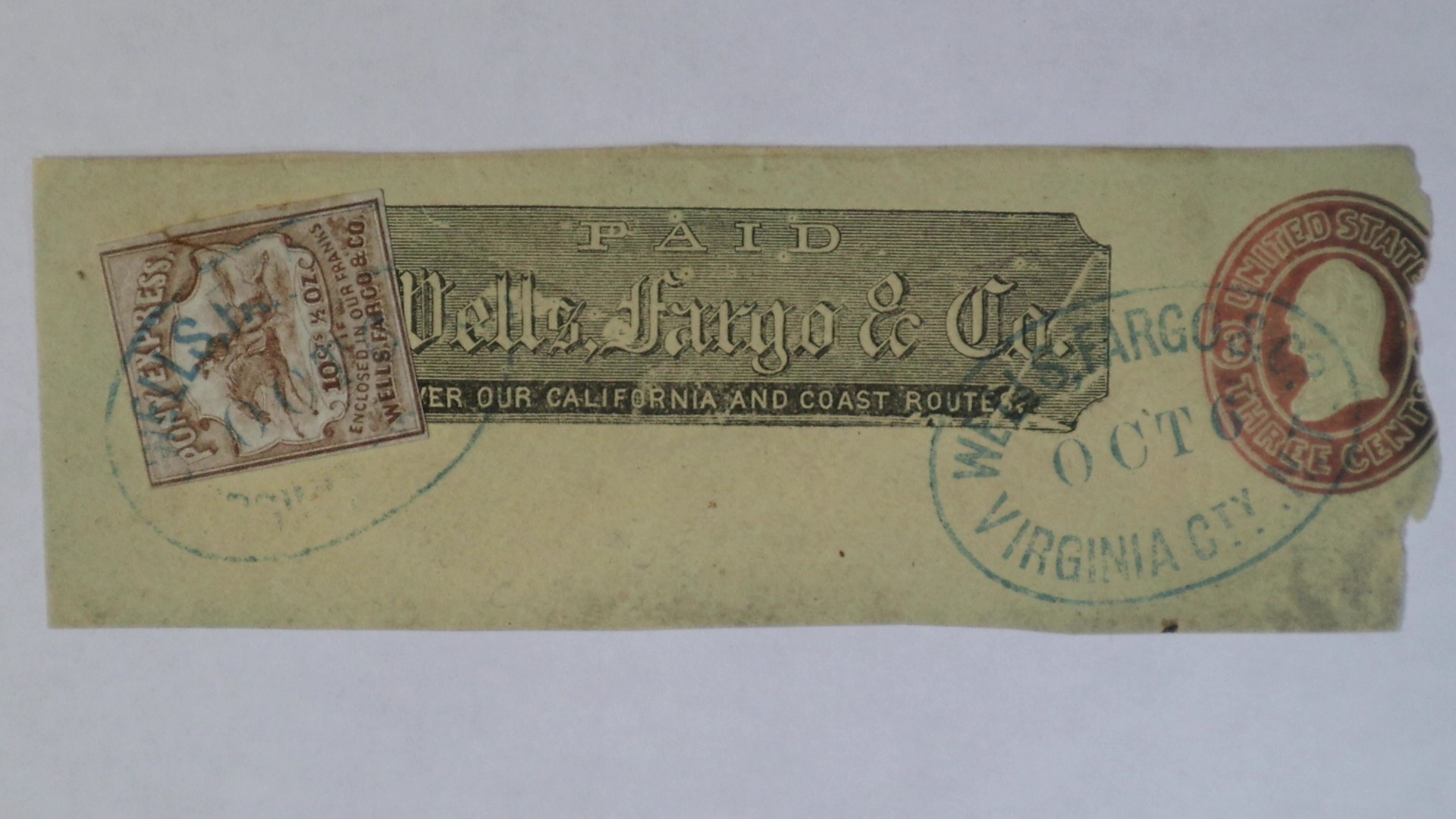 10c Brown Virginia City Nevada Territory Pony Express Stamp Tied on Wells Fargo Frank 3c Piece