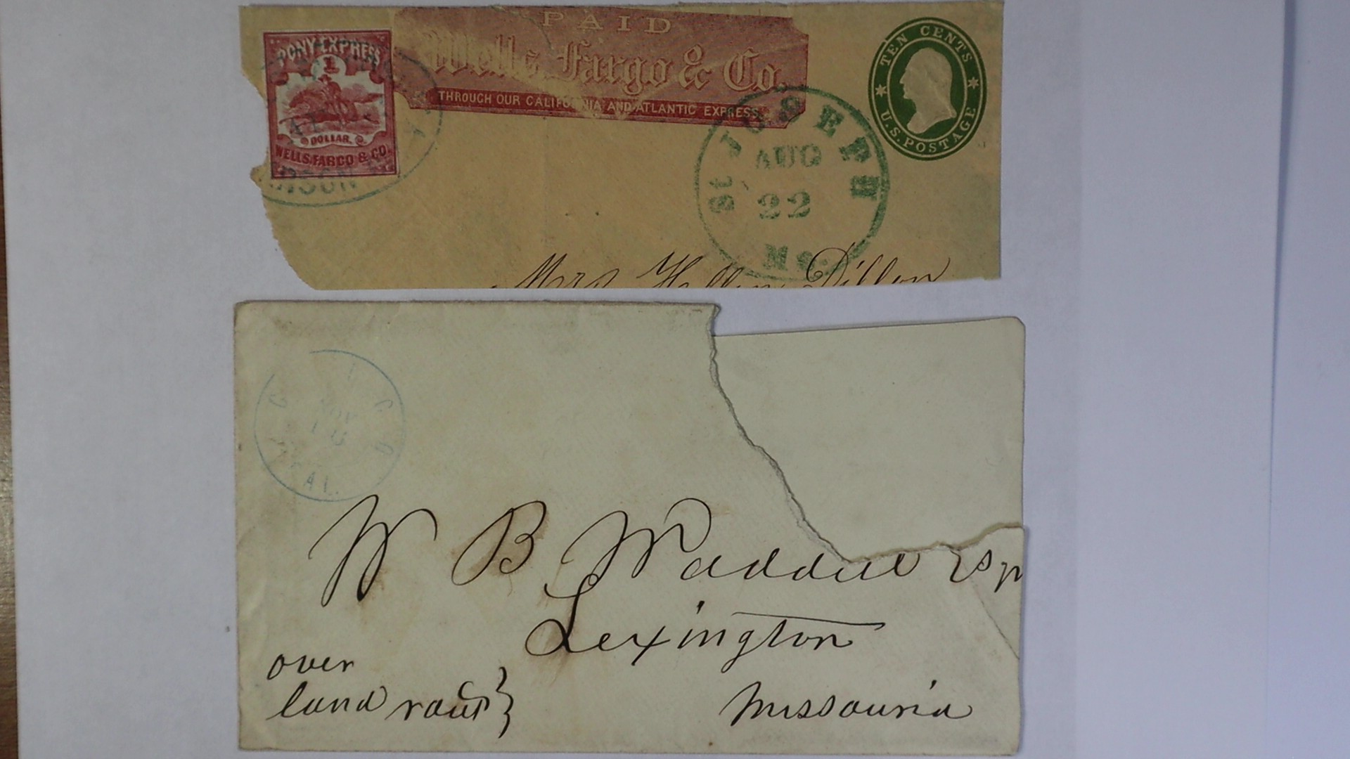 to Mrs. Hellen Dillion. (Overland Pony Express) Wells Fargo & Co., 1861 $1 red, Pony Express Adhesive Scott No. 143L3 margins ample to touching, tied by blue Wells, Fargo & Co. Carson City oval on 10c Star Die entire, with company red frank (Through Our California and Atlantic Express) with green St. Joseph, Mo. Aug 22 transit cds. Other envelope with stamp removed at right canceled Nov. 16 Chico Cal. addressed to W/B Waddell Lexington Missouri , manuscript Over Land Mail at left.