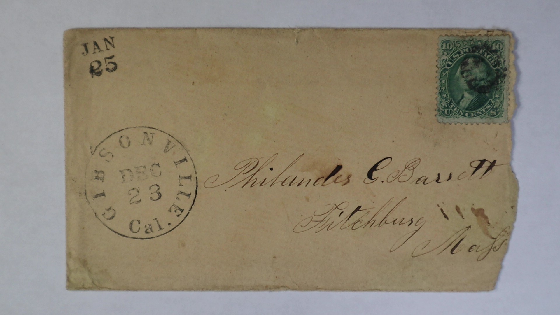 Dec 23 1860s Gibsonville Sierra California 10c rate Cover to Fitchburg Mass