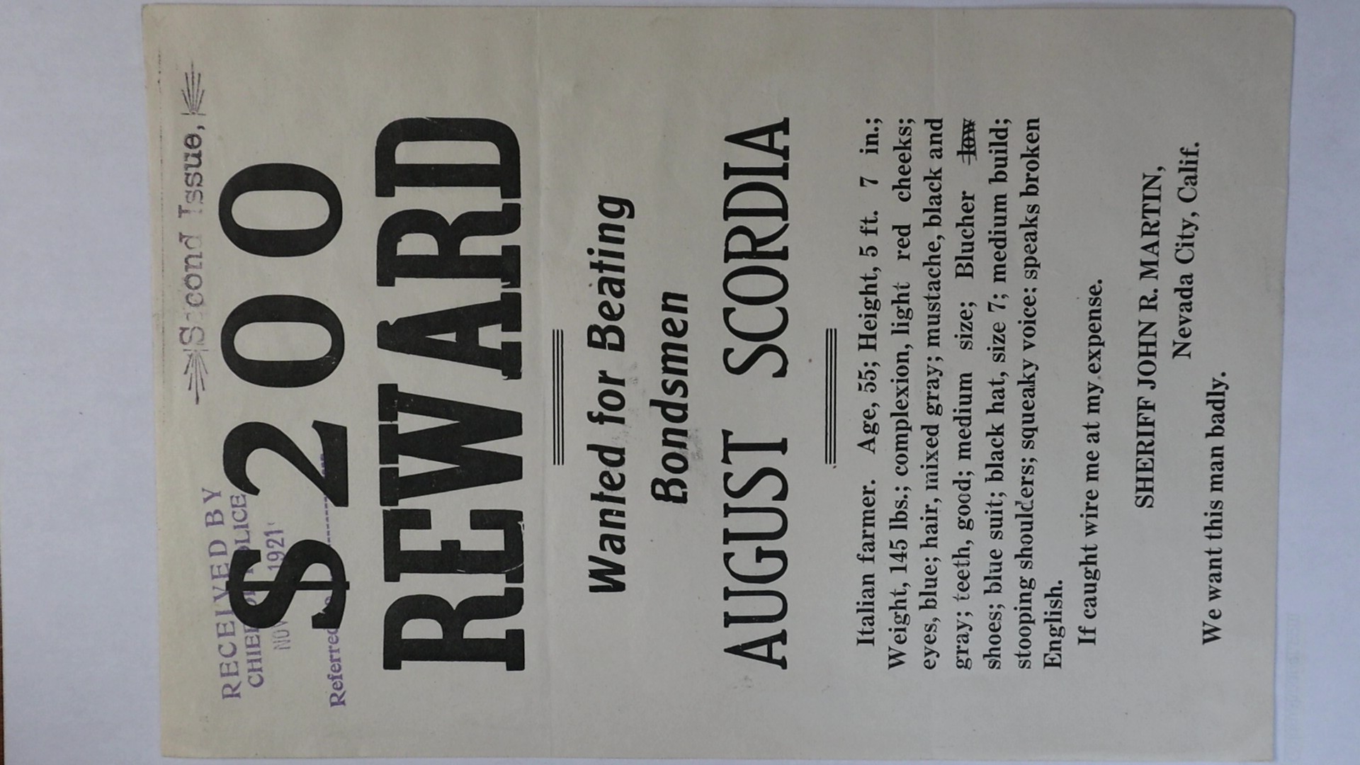 1921 Nevada City CA $200 Reward Wanted for Beating Bondsmen August Scordia Italian Farmer
