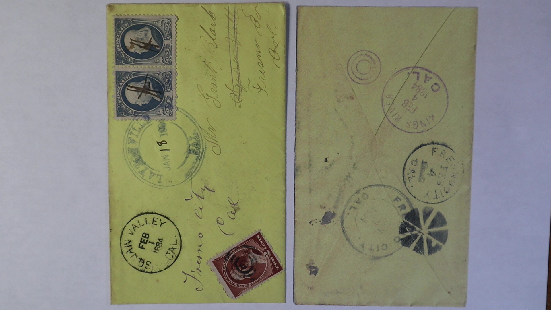 Laytonville Mendocino cancel type (MEN-1960) Squaw Valley Feb. 1 1884 is the only recorded date and book example Williams California Town Postmarks Book Volume Page 232. Three received postmarks at back Fresno City X2 and Kings River Cal.