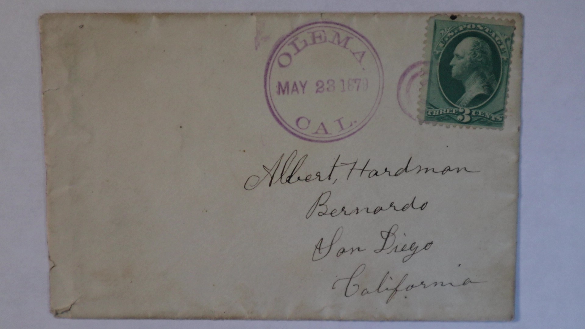 May 23 1879 Olema California 3c Bank Note Purple Cancel Cover to Bernardo San Diego Cal.