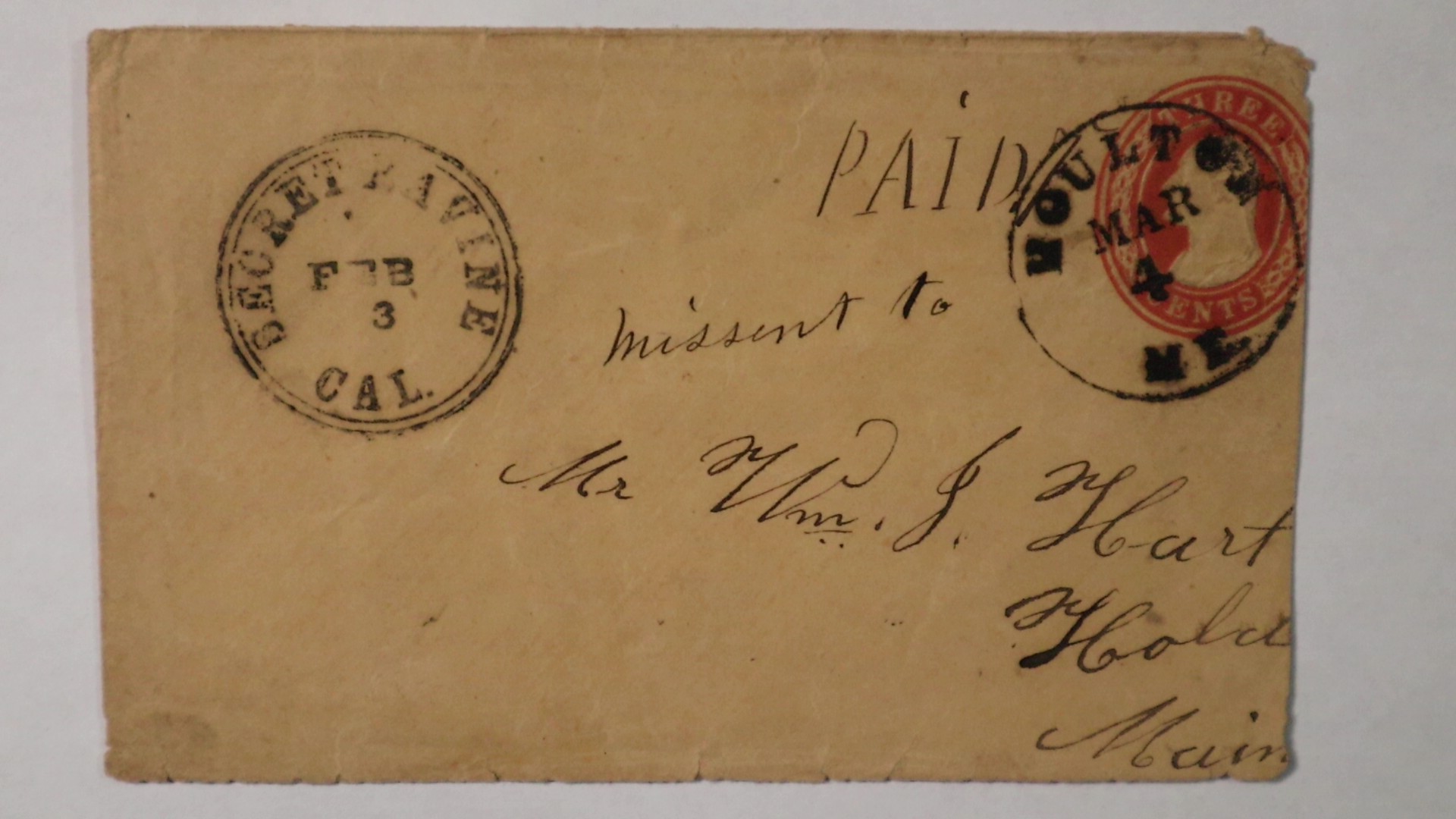 sent tp Mr. Wm. J. Hart Houlton Maine. Cover reduced at right edge, some wear at edges. (PLA-3300) this cancel is the book example Volume #2 page 743 John Williams California Town Postmarks book. Years of Post office operations Aug. 29 1854 to March 25 1863 name change to Auburn Station.