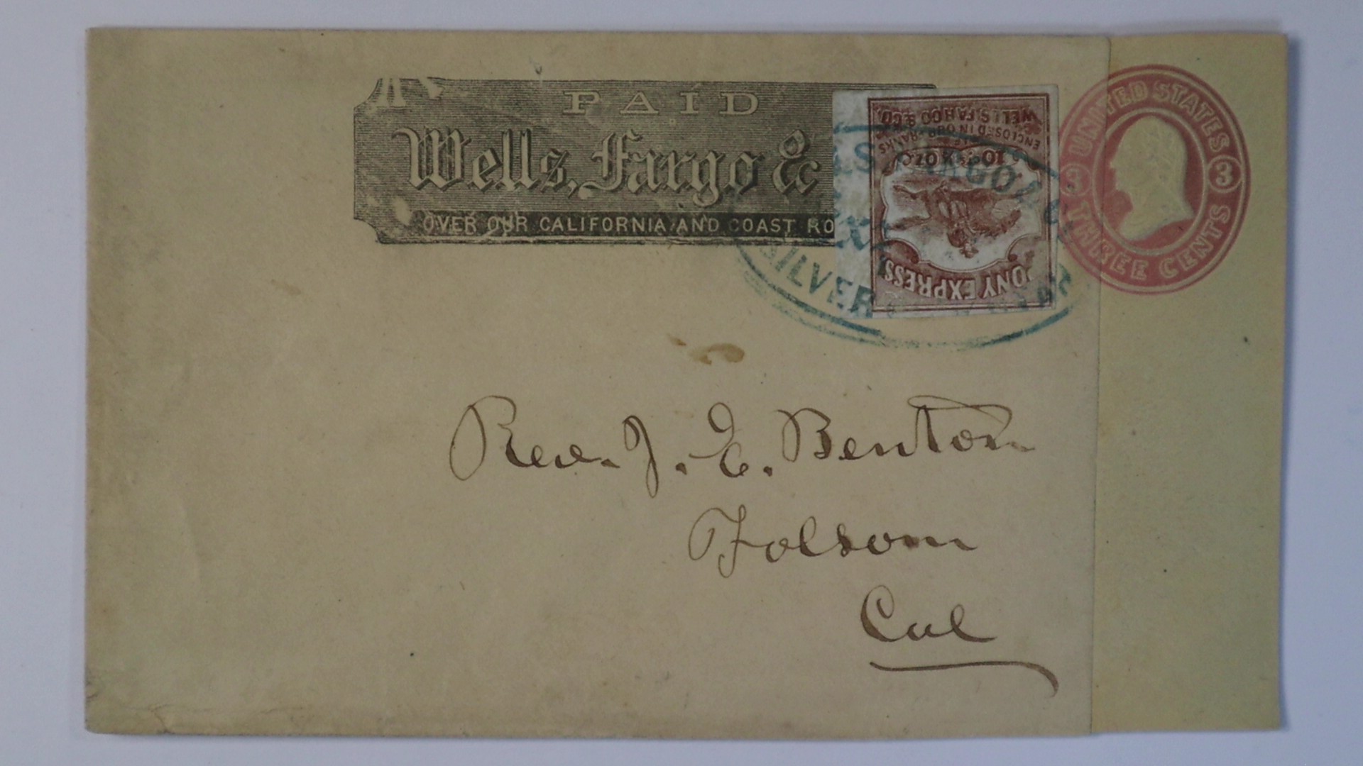 manuscript at left A.K. Gwin received Oct. 21/63 (1863) Wells, Fargo & Co. Virginia City, N.T., Oct. oval date stamp on 3c pink entire (U35) to San Francisco, with second strike canceling indicia, bold blue "B.F.H. & Co. Oct 19, 1863 company cds at center (B.H. Hastings & Co., bankers) used in lieu of express frank. The absence of the Wells Fargo frank on this entire is in accordance with a little known agreement between Wells Fargo and other banking institutions allowing them to transmit, via Wells Fargos express lines, envelopes displaying the banks handstamp in lieu of the Wells Fargo frank. B.H. Hastings briefly had a field office in Virginia City, therefore complying with this agreement. In Sacramento B. F. Hastings Building, which was the western terminus for the transcontinental Pony Express from 1860-1861. This cover during what is known as the Wells Fargo Virginia City Pony Express period going to and from the Comstock mining operations. Cover expert repaired at right. Ex Henry Clifford collection.